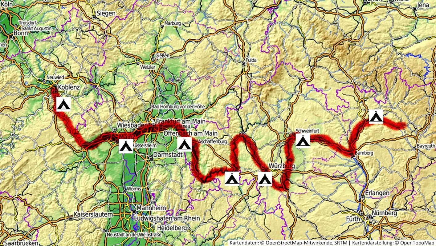 Kulmbach -> Lichtenfels -> Bamberg -> Schweinfurt -> Würzburg -> Aschaffenburg -> Frankfurt -> Mainz -> Bingen -> Loreley -> Koblenz