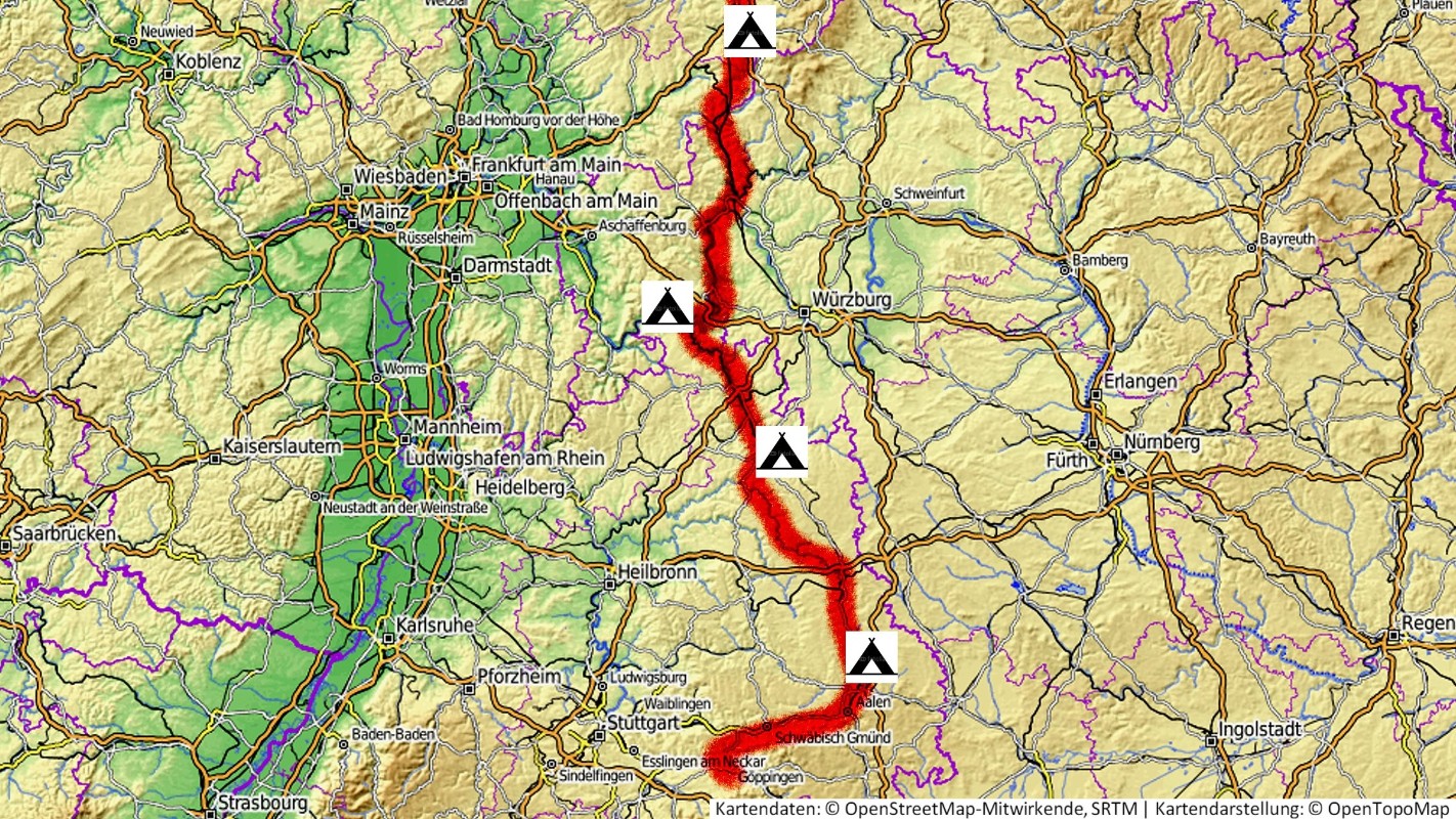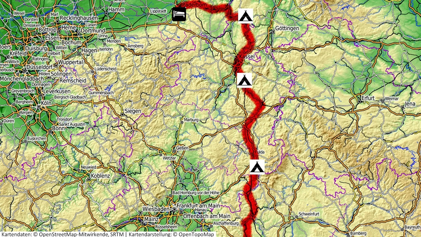 Göppingen -> Schw.Gmünd -> Aalen -> Ellwangen -> Bad Mergentheim -> Wertheim -> Lohr -> Sinntal -> Fulda-> Kassel -> Hann.Münden -> Beverungen -> Paderborn