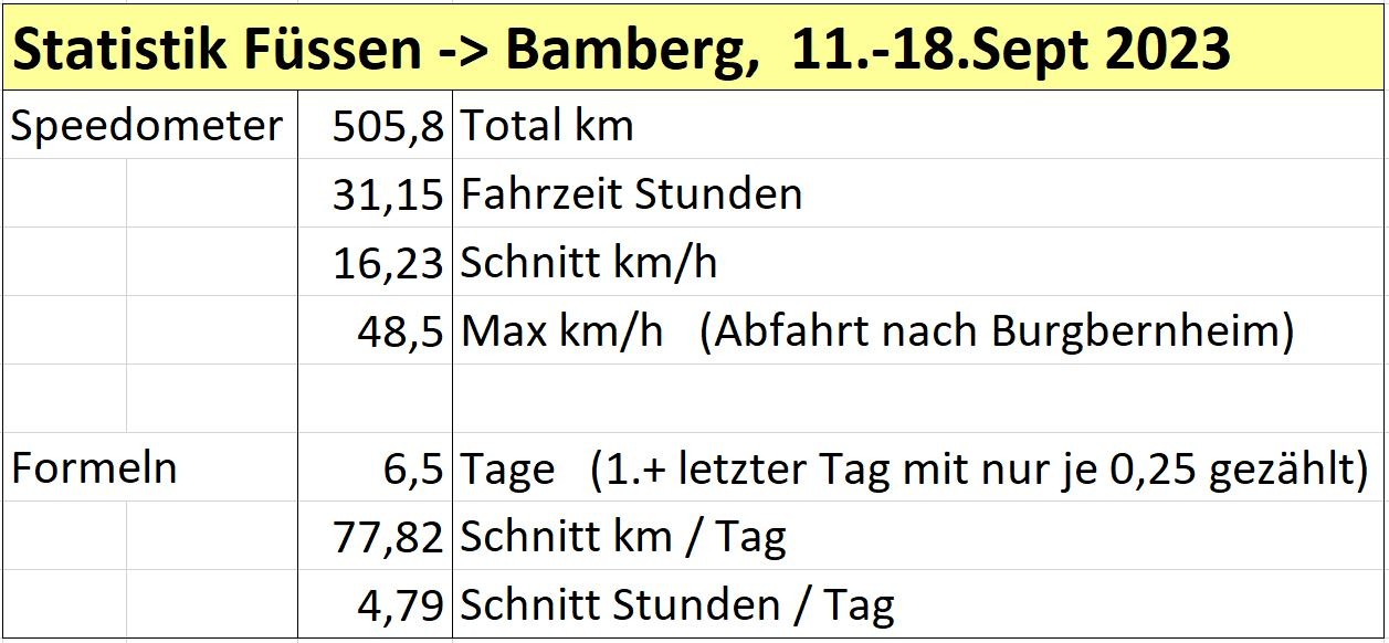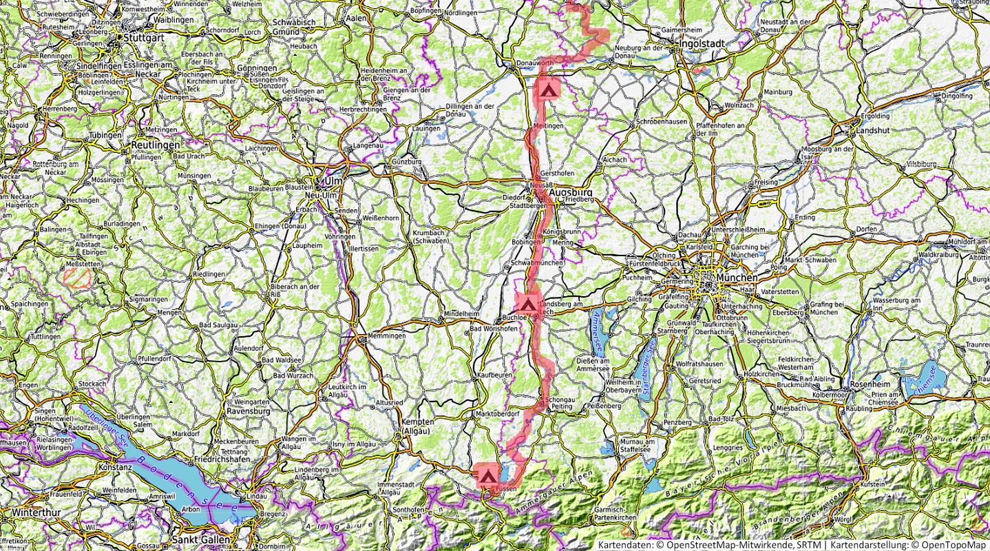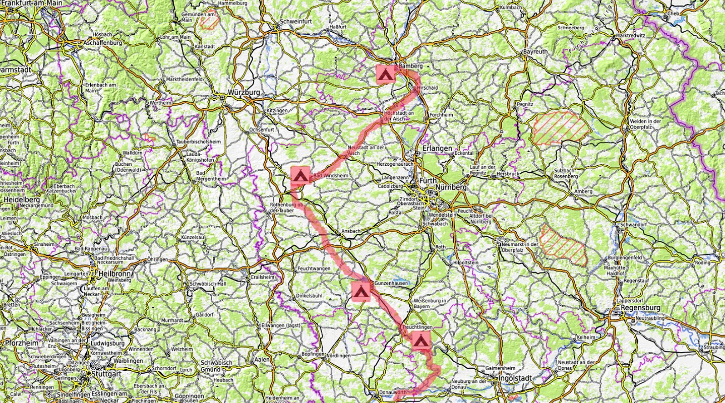Füssen -> Landsberg -> Augsburg -> Marxheim -> Dollnstein -> Treuchtlingen -> Altmühlquelle -> Aischquelle -> Bad Windsheim -> Neustadt -> Bamberg