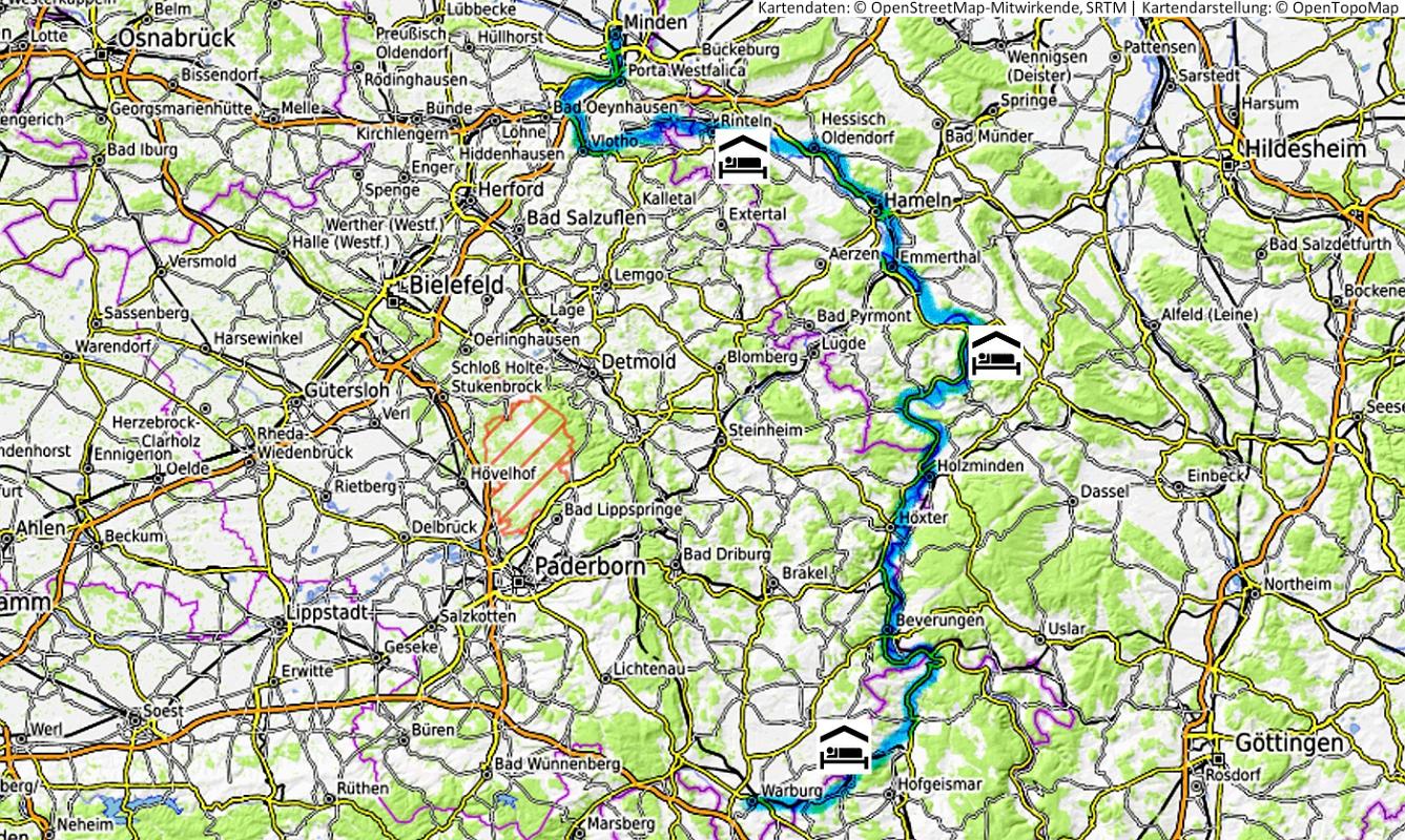 Warburg -> Trendelburg -> Bad Karlshafen -> Hameln -> Porta Westfalica -> Minden